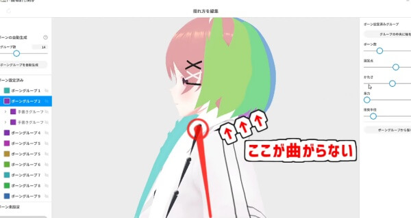 この問題は、髪の毛の揺れの根元の位置が低く、そこから曲がっていることが原因です。
