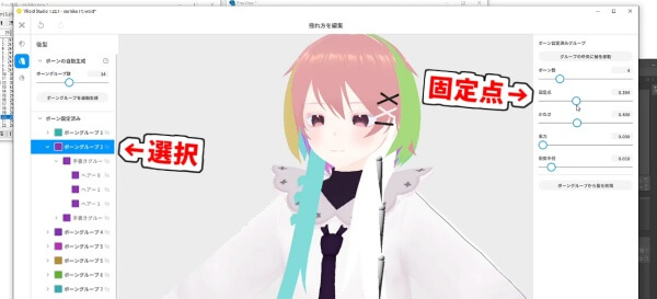 ボーン設定済みの中からいじりたいボーングループを選択し、「固定点の高さ」を変更します。