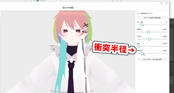 余談ですが、この設定画面で「衝突半径」を大きくすると、髪の毛が服を貫通する問題もある程度改善できます。