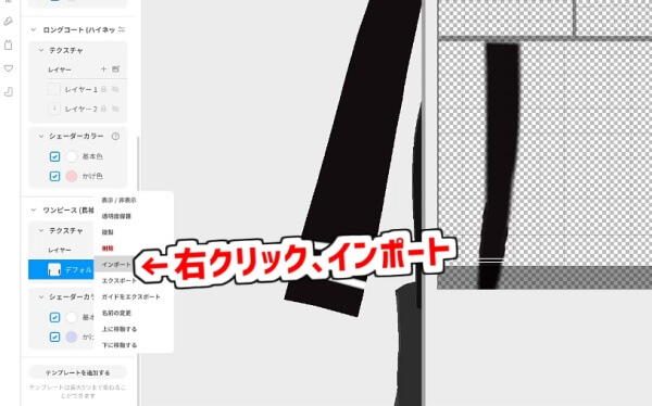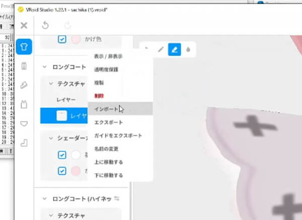 描き終えたら保存し、「VRoidStudio」でテクスチャを右クリックして「インポート」で差し替えます。