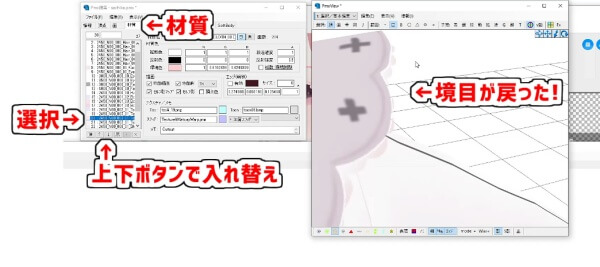 「PMXEditor」の材質タブでテクスチャをクリックして選択し、上下ボタンで順番を整えます。