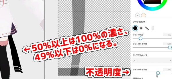 VRMモデルでは50%以上の濃さのみ表示し、それ以下は非表示にする処理が行われるため、VRM形式では問題なく見えています。