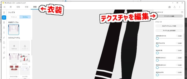 「VRoidStudio」の衣装タブから、該当の衣装の「テクスチャを編集」をクリックで開きます。