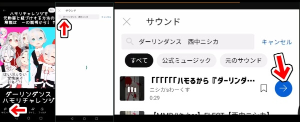 Shorts動画投稿画面の左下にある「サウンド」を選択し、サンプリングしたい動画を検索して音声を追加します。