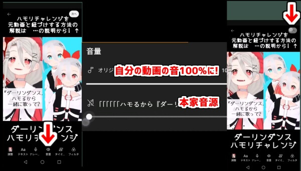 投稿動画に既に音声が入っている場合は、音量をタップし元動画の音量を0%にしましょう。