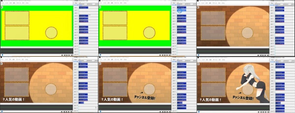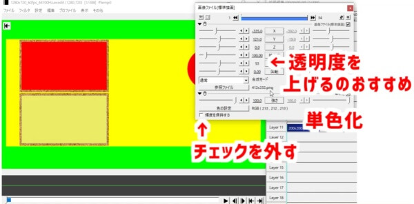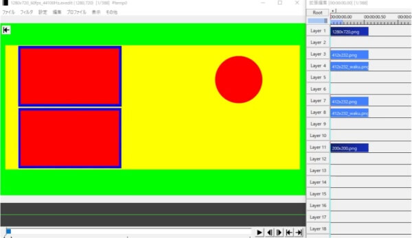 まずはテンプレート内の「置き場所用」、「動画要素」を2セット、「登録要素セット」を全てAviutlのレイヤーにドラッグ&ドロップで読み込みます。