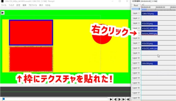 配置できたら、枠の1つ上のレイヤーにテクスチャ画像を読み込んで、右クリックし「上のオブジェクトでクリッピング」を選択しましょう。