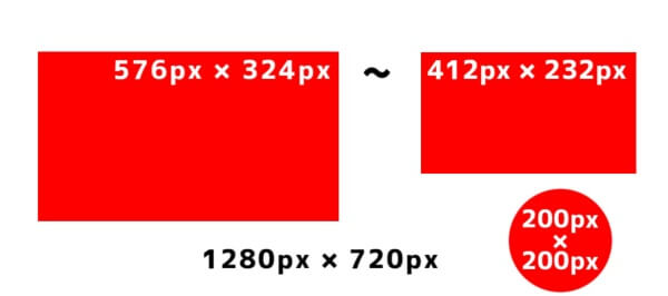 終了画面に配置する要素の大きさは、1280×720pxの動画ですと、動画や再生リストは四角形で576×324px〜412×232px、チャンネル登録ボタンは丸型で200×200pxです。