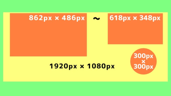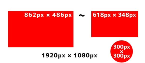 1920×1080pxの場合は、四角形が862×486px〜618×348px、丸型が300×300pxとなります。
