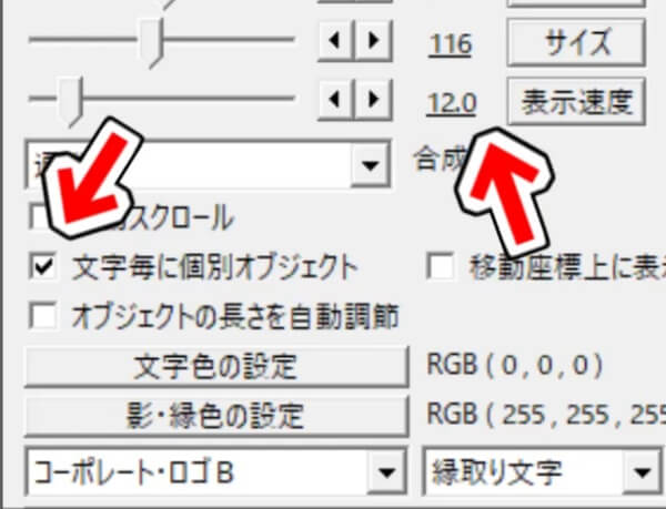 文字にこのエフェクトをかけるのであれば、「文字毎に個別オブジェクト」にチェックを入れて、表示速度を調整すれば、セリフとテロップの速度を合わせて表示することができます。