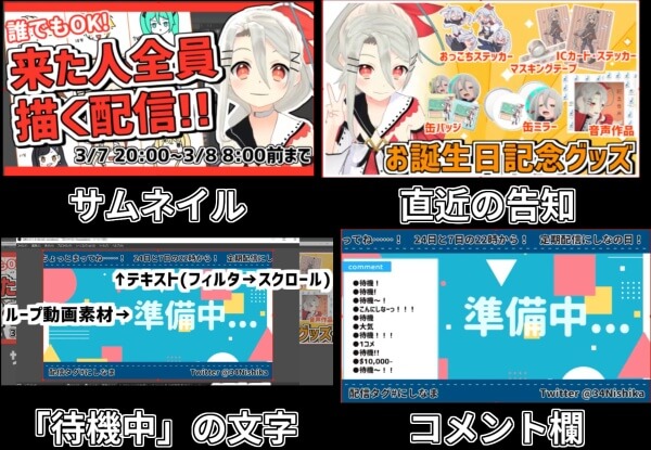配信用の待機画面を用意することで、配信開始後にツイートで共有する時間や、準備を裏でがんばる時間を確保することができます。