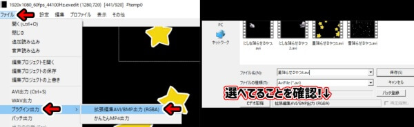 素材が完成したら、ファイルの「プラグイン出力」を選択し、「拡張編集AVI/BMP出力(RGBA)」をクリックして出力します。