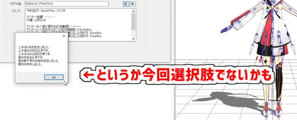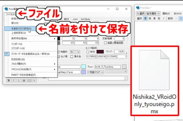 「ファイル」→「名前をつけて保存」でPMXファイルを保存します。
