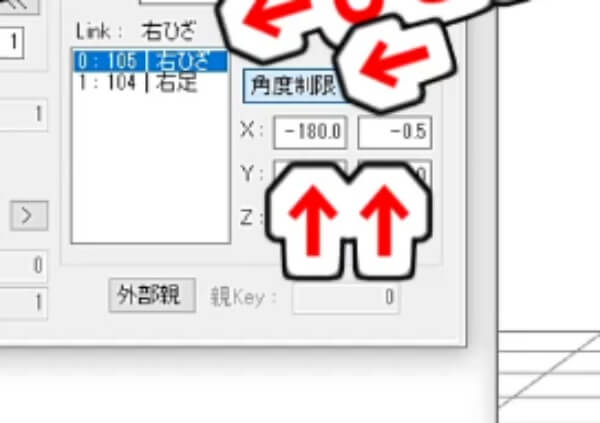 「左足IK」「右足IK」のそれぞれで、Linkのひざをクリックし、角度制限が青く光っていることを確認します。