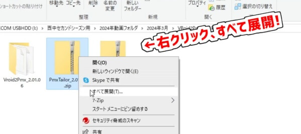 それぞれダウンロードしたzipファイルを右クリックし、「すべて展開」で開きましょう。