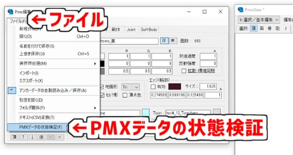 「ファイル」→「PMXデータの状態検証」を実行します。