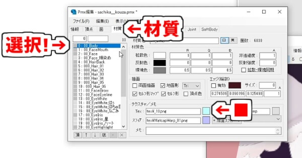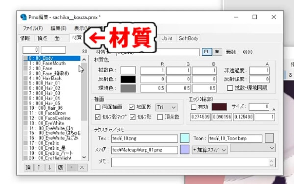 「PMXEditor」のPmx編集メインウィンドウで、材質タブを開きます。