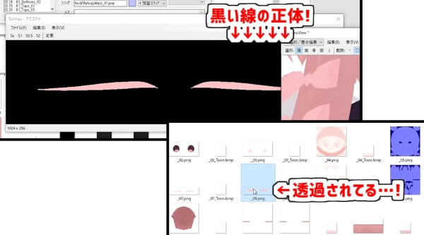 ここで周囲が黒くなっているテクスチャは、Texフォルダの元画像を確認しても正常に透過されているのに、PMXEditor上では周囲に黒い線が出てしまうテクスチャになっています。