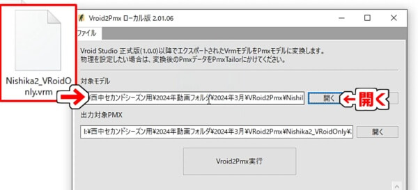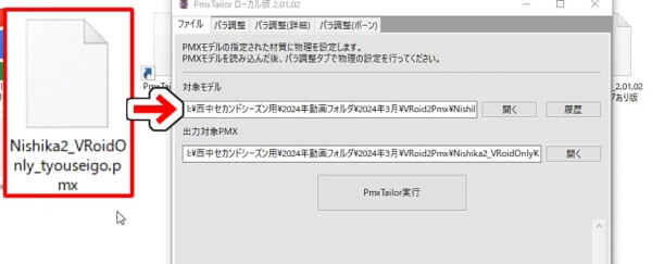 先ほど保存したPMXモデルを、対象モデルの欄にドラッグ&ドロップで読み込むか、「開く」から選択します。
