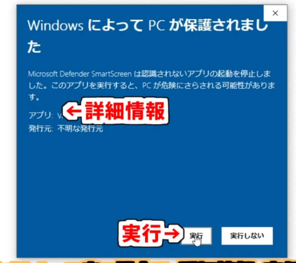 「保護されました」と表示される場合は、「詳細情報」→「実行」をクリックします。