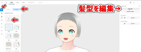 今回は前髪を選んでいないので、カスタム→新規作成→髪型を編集と選択して編集していきます。