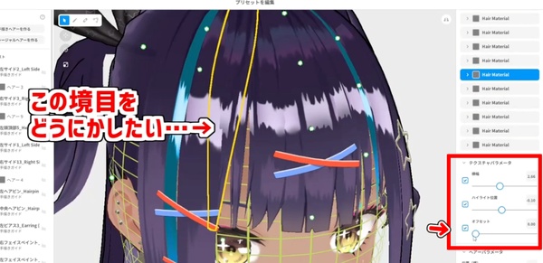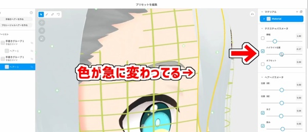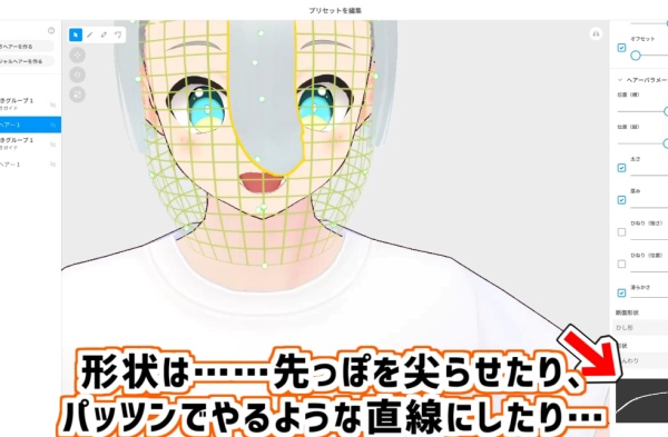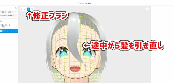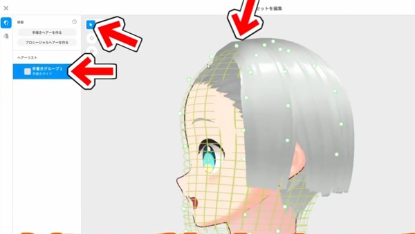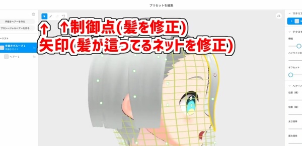 編集画面を開いたら、まずは手書きグループのネットを動かして髪の毛の沿う面を調整します。