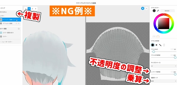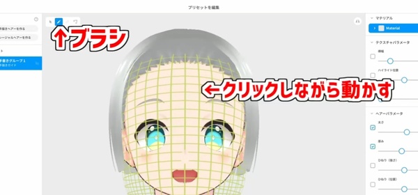 髪の流れの線は、テクスチャ編集画面の一番右にあるブラシを使うと簡単に表現できます。