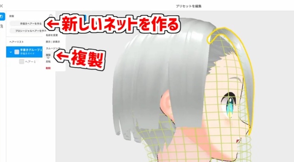 違う形のネットが必要になったら、「手描きヘアーを作る」を押して新しいネットを作ります。