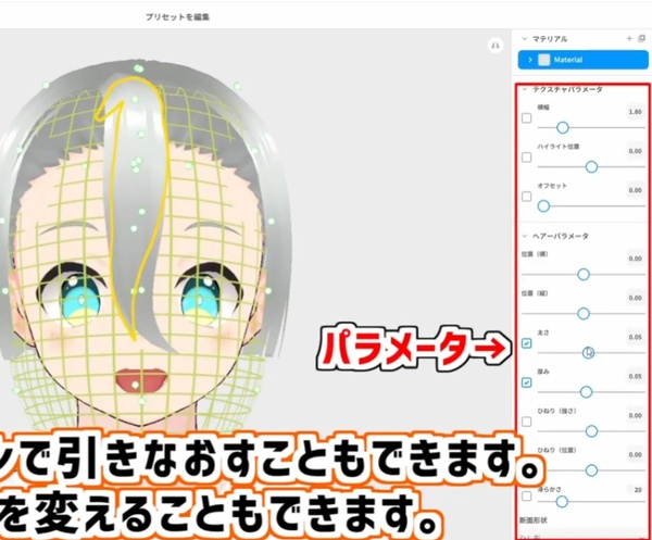 そのほかにも、髪の毛の位置や太さ、厚み、ひねり(うねり具合?)やなめらかさもパラメーターで調節することができます。