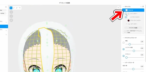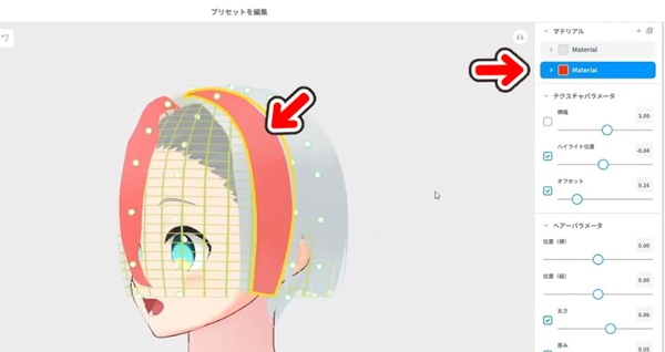 矢印でヘアーをクリックして、右上の「マテリアル」からテクスチャを編集をクリックします。