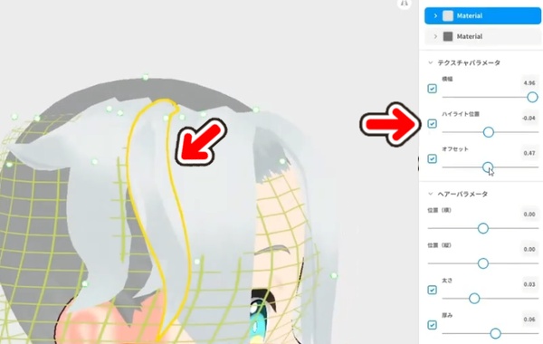 マテリアルでは、それぞれの髪のパラメーターを調整することもできます。