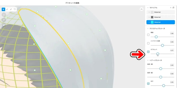 オフセット調整では、テクスチャの表示幅を調整できます。