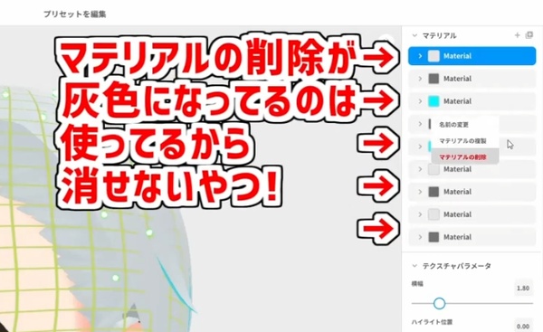 なぜかマテリアルが勝手に2倍に増えることがあるので、右クリックで見つけ次第消しておきましょう。