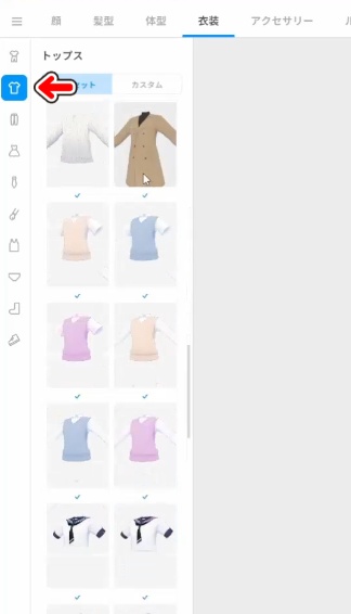 まずは衣装タブを開いて作りたい衣装に近いイメージ・形の服を選んでいきます。