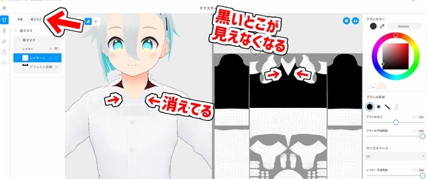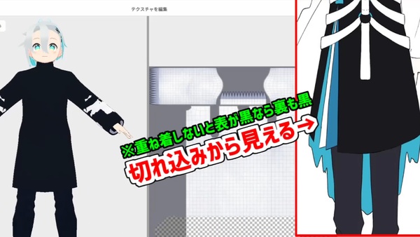 テクスチャ画面上の黒い部分が見えなくなり、服を作る際にわかりづらくなるため、一旦レイヤーを追加して白く塗り潰し、肌が見えるようにしておきましょう。