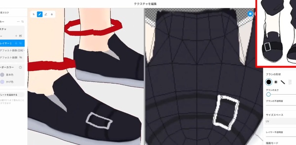 シッポベルトの先の形状がガタガタになってしまっていたので、尻尾のテクスチャの書き込み先を体から離れるワンピースに、途中から置き換えてみました。