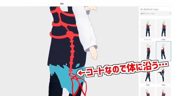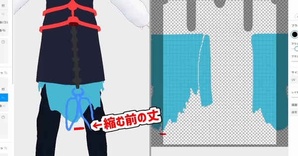 VRoid上ではパラメータを合わせたうえで、どこまで下げるかの印をつけておきました。