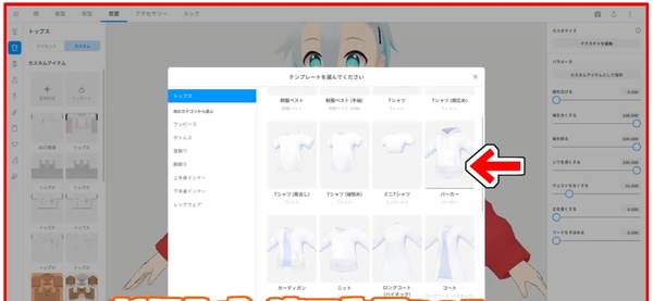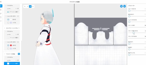 服のベースによって調整できるパラメーターが変化する場合があるので、一番イメージに近い形にできるものを探して選んでください。