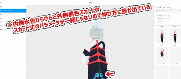 裏地がめり込んでしまうのは、裏地に使用したスカートと外側の黒いスカートのスカート丈のパラメータが同じでないため、動いた時の伸び方に差が出てしまっていることが原因のようです。