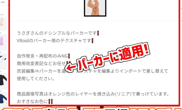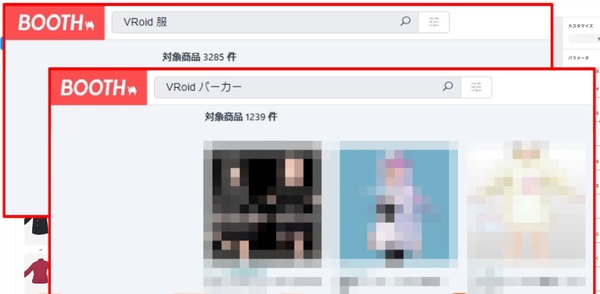「VRoid 服」や「VRoid パーカー」などで検索すると、いろいろな衣装素材が出てきます。