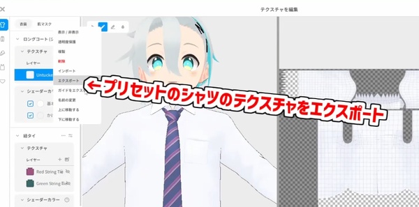 シャツの皺のテクスチャなど、描くのが難しい部分についても、プリセットのアイテムのテクスチャをエクスポートしておけば、流用することができます。
