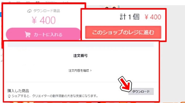 有料のアイテムは、カートに入れてレジへ進み、決済をしたのちの画面でダウンロード、もう一度ダウンロードと押し進めてください。
