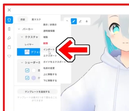 適用先を確認したら、VRoidの衣装タブのカスタムより新規作成をクリックし、適用先通りのテンプレートを選択しましょう。