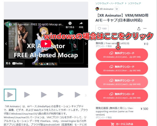 XRAnimatorは、こちらのBOOTHの無料ダウンロードをクリックし、ダウンロードできます。